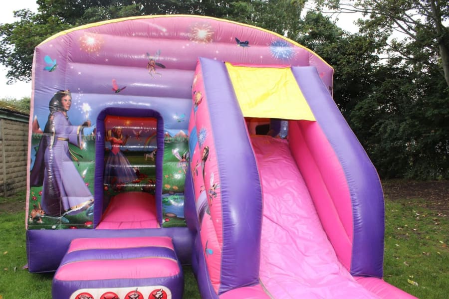 A fully featured Bounce and Slide Combo with sewn in shower cover, deep bounce bed, netted windows, superb digitally printed artwork in a fantastic Princess theme, fully webbed bed and step and removable slide sheet.