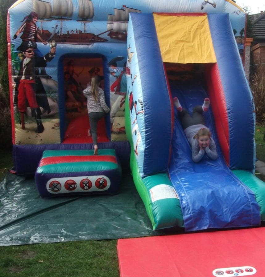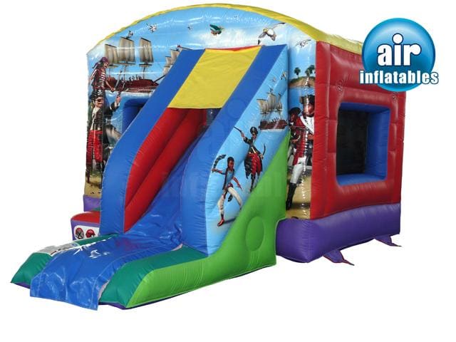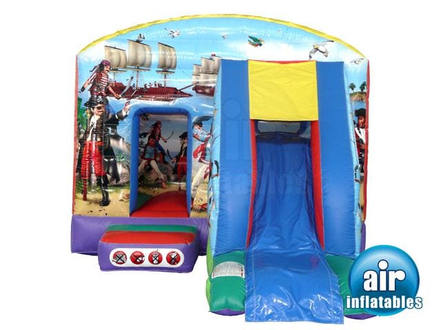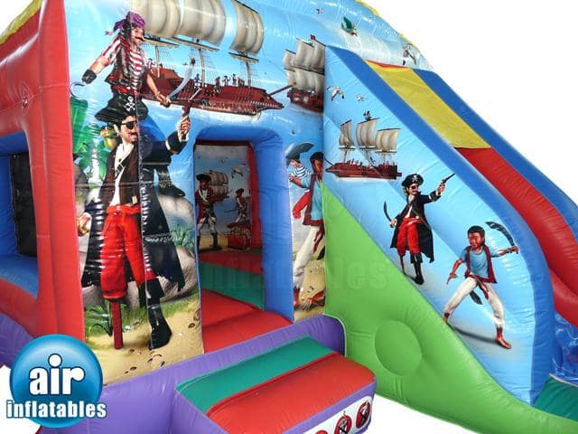 A fully featured Bounce and Slide Combo with sewn in shower cover, deep bounce bed, netted windows, superb digitally printed artwork in a fantastic Pirates theme, fully webbed bed and step and removable slide sheet.